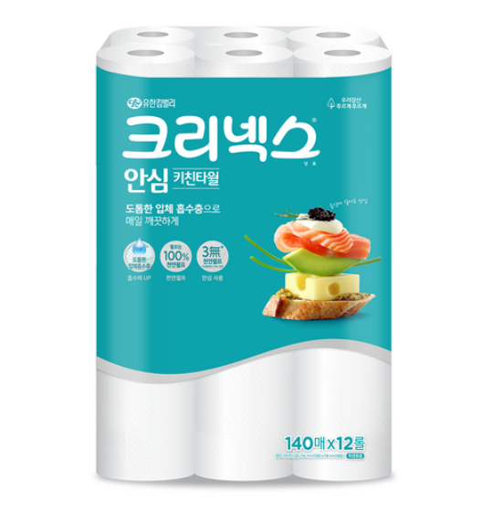 크리넥스 안심 키친타월은 140매 × 12롤 구성으로 오랫동안 사용할 수 있는 대용량 제품입니다. 유한킴벌리 정품으로 품질 신뢰도가 높으며, 흡수력은 기존 대비 30% 이상 향상되어 주방 청소부터 요리, 세척까지 다양하게 활용할 수 있습니다. 환경을 생각한 천연 펄프 사용으로 피부 자극 걱정 없이 사용할 수 있으며, 위생적인 포장으로 보관도 깔끔합니다.